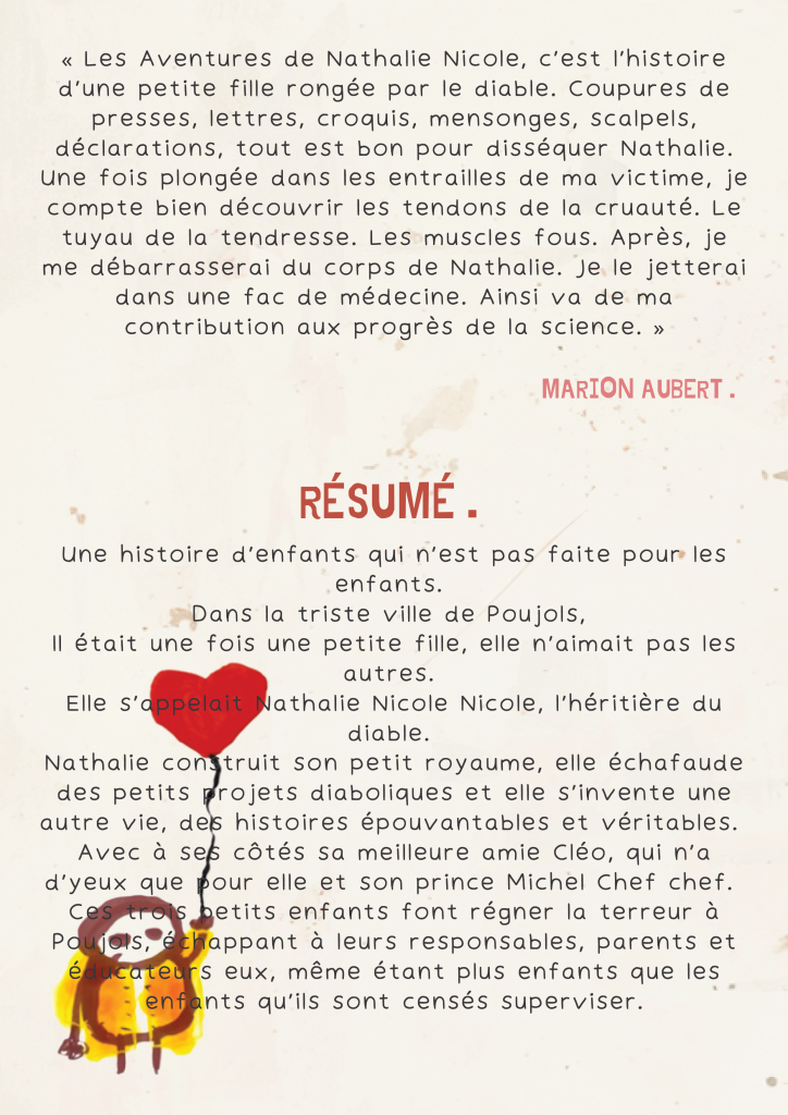 Nathalie est une compteuse de récit rocambolesque où elle se proclame reine, diablesse ou encore petite fille très intéressante, pour se voir briller dans les yeux de ses auditeurs, pour ressentir l’impact de son comportement sur le monde qui l’entoure amis aussi pour essayer de ne pas casser ces deux cœurs parce que c’est dur d’être à la hauteur quand on a de tels parents.
