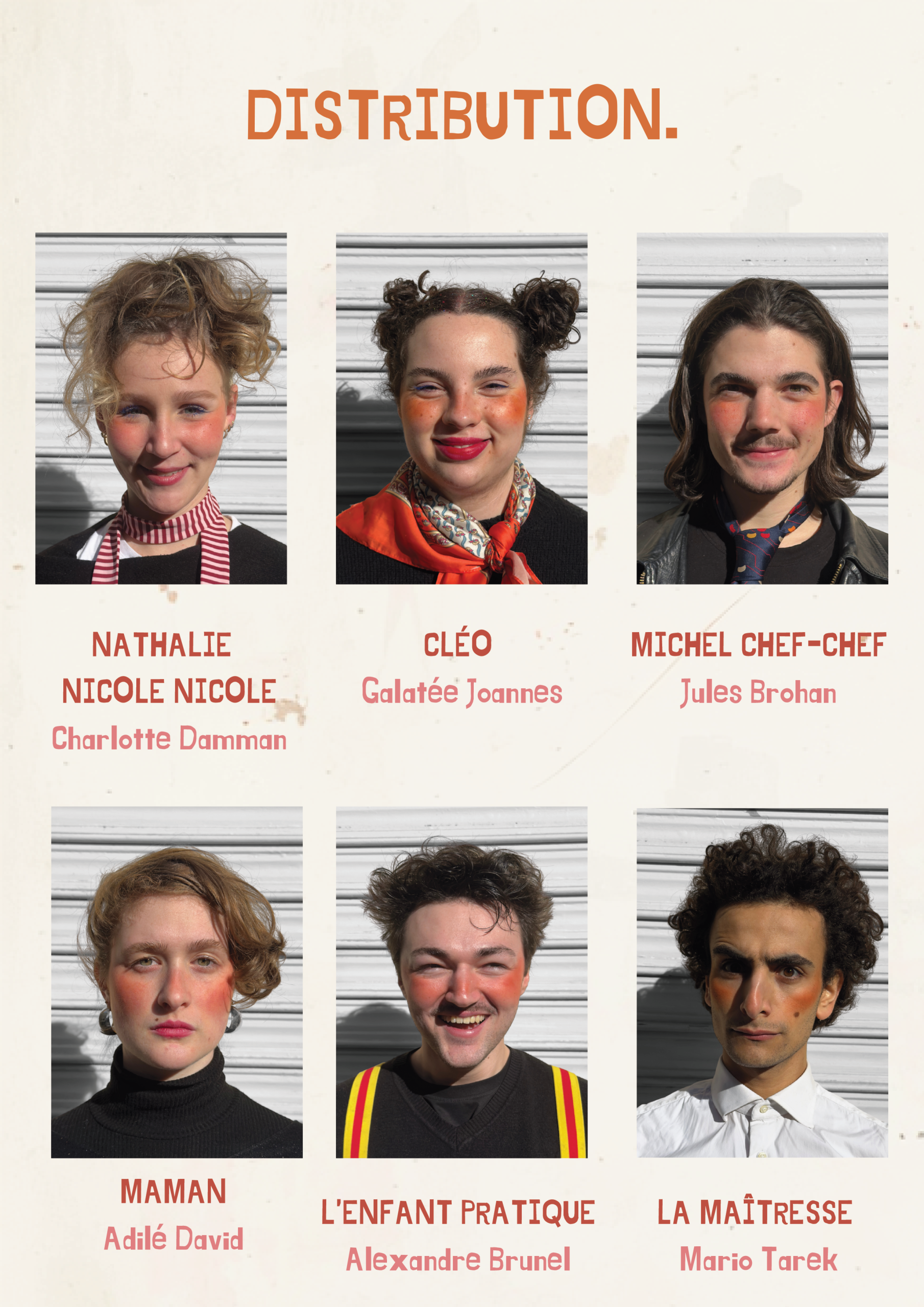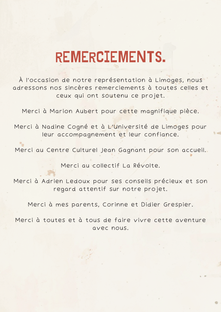 Notre groupe s’est formé lors de notre formation au Cours Florent, école privée d’art dramatique reconnue pour sa formation professionnelle d’acteur·rice·s. C’est là que nous nous sommes rencontré·e·s et que s’est construit notre désir de créer ensemble. Notre premier projet a vu le jour dans le cadre de notre Travail de Fin d’Études, une création réunissant seize interprètes. L’Université de Limoges nous a accueilli·e·s en résidence, à l’issue de laquelle nous avons été invité·e·s à jouer au Centre municipal Jean Gagnant. Aujourd’hui, nous poursuivons notre aventure avec ce nouveau projet, rejoint par deux artistes supplémentaires et qui sera, nous le voulons, un événement.