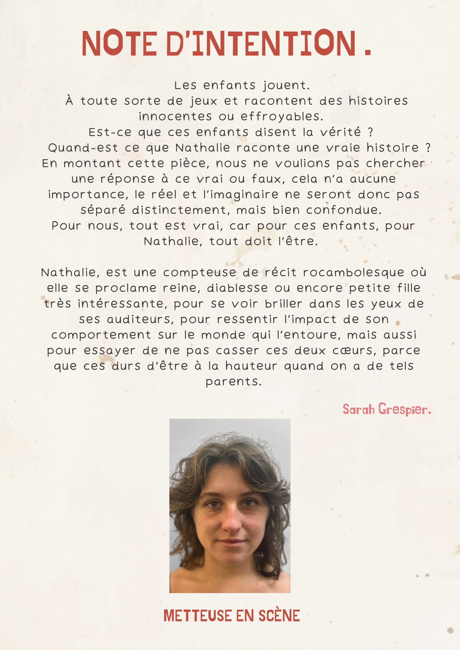 Quand est ce que Nathalie raconte une vraie histoire ? En montant cette pièce, nous ne voulions pas chercher une réponse est-ce vrai ou faux, cela n’a aucune importance, le réel et l’imaginaire ne seront donc pas séparés distinctement mais bien confondus. Pour nous, tout est vrai, car pour ces enfants, pour Nathalie, tout doit l’être.