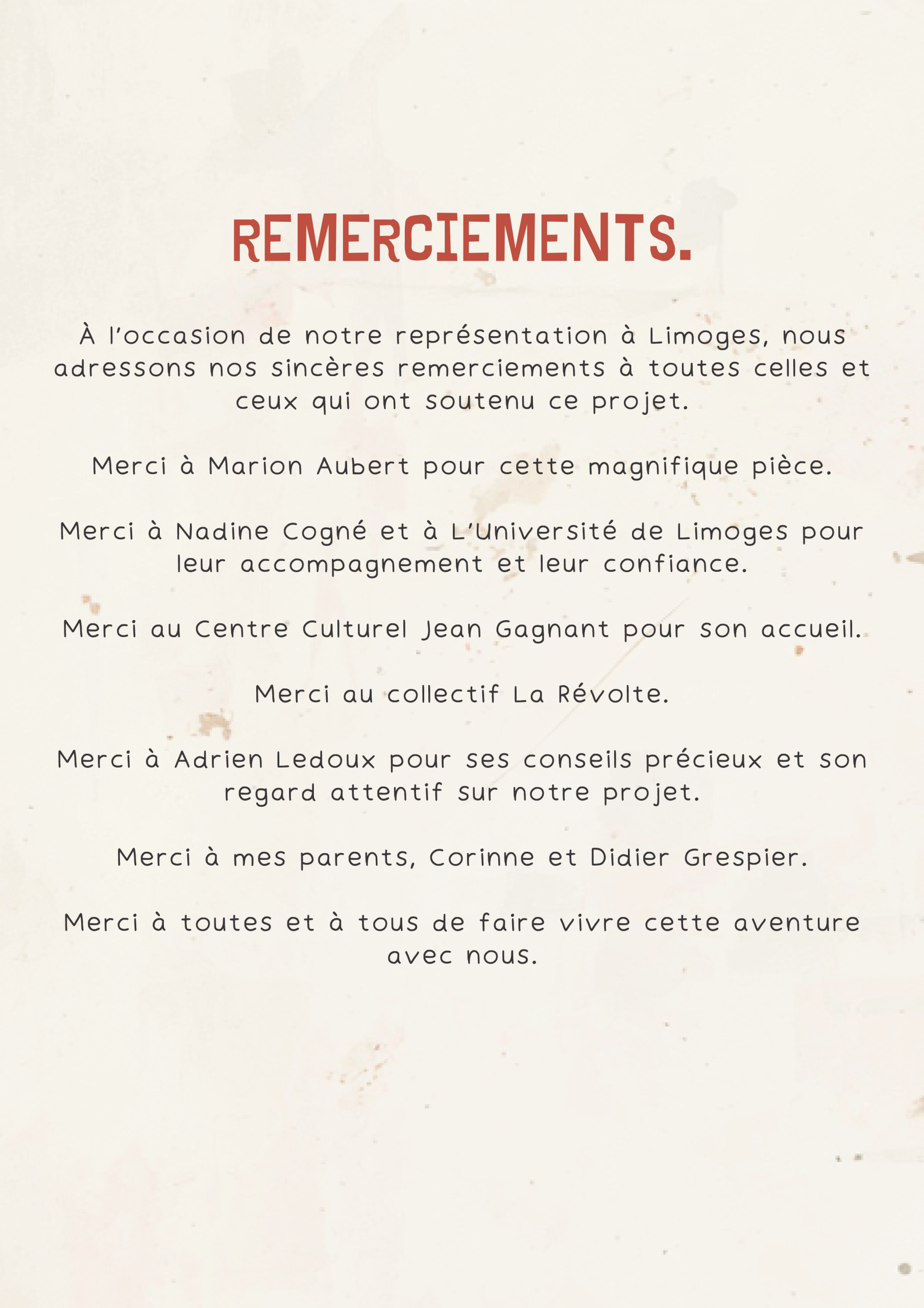 Notre spectacle est accueilli par le collectif La Révolte, un collectif pluridisciplinaire de jeunes artistes professionnel·le·s et autonomes, qui explore l’art dans toutes ses formes.