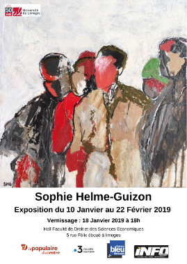Catégories : Exposition Exposition Sophie Helme-Guizon Détails Début: 10 janvier 2019, 9 h 00 min Fin: 22 février 2019, 21 h 00 min Lieu: Faculté de Droit et des Sciences Economiques Catégories: Exposition Présentation Du 10 Janvier au 22 Février, le Hall de la faculté de droit et de sciences économiques de Limoges accueillera les oeuvre de l’artiste peintre Sophie Helme-Guizon. Plan