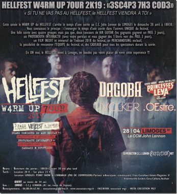 Avec leurs 20 ans d’existence, 6 albums studio et un grand nombre de concerts à leur actif les marseillais de Dagoba ont propulsé leur Death Metal Mélodique léché un peu partout. Tournée en France, Europe, usa et même japon au côté de grandes références du métal jusqu’à marquer les souvenirs de leurs fans avec un wall of death inoubliable à Clisson en 2014. Après 18 mois de dates intensives, DAGOBA clôture le chapitre de son dernier Album « Black Nova » et vient proposer un show spécial gonflé d’une scénographie vidéo dédiée à cette Warm Up Hellfest 2019. La sueur et les cris seront au rendez-vous ! Dagoba
