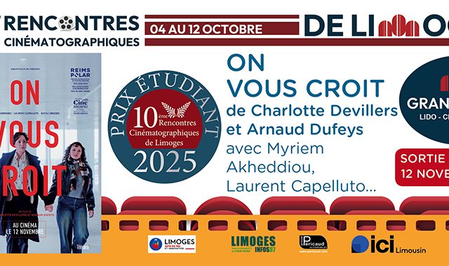 Les 10 èmes Rencontres cinématographiques de Limoges se sont tenues du 4 au 12 octobre 2025. Après 9 jours consacrés à la diffusion de 22 films en avant-première, le public de Limoges et les membres du jury étudiants ont désignés leurs lauréats : Prix du Public : FURCY NE LIBRE de Abd AL Malik Prix des Etudiants : ON VOUS CROIT de Charlotte Devillers et Arnaud Dufeys. Ce palmarès clos une manifestation riche en rencontres de qualité et en découverte de films à venir sur nos écrans. Nous remercions tous les étudiants qui ont participé au jury qui pour la plupart sont inscrits à l'atelier cinéma de l'université sous la direction de Laurent Moreau.