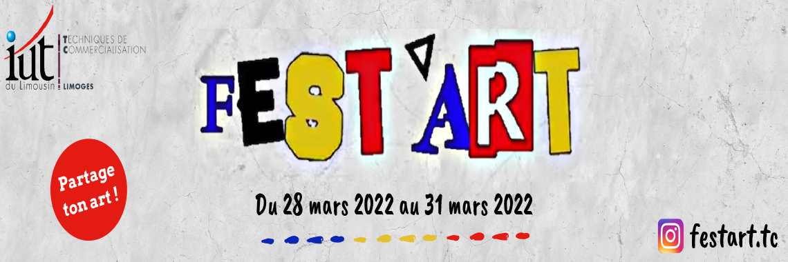 Le projet tuteuré FEST'ART est un travail mené par un groupe d’étudiants en Techniques de Commercialisation au sein de l'IUT du Limousin sur le campus de Limoges. Les membres de ce groupe souhaitent organiser un challenge artistique dans le thème du Street Art entre tous les étudiants des sites de l'IUT du Limousin. Ce concours artistique vise à vous réunir aussi bien comme participant partageant sa passion et son art que comme spectateur amateur ou novice. N’attendez plus et venez révéler votre talent ou bien mettre en avant vos projets ! Ce challenge artistique digital va se présenter sur notre compte Instagram où toutes vos œuvres seront publiées. Enfin, pour élire les gagnants, il y aura un vote de nos abonnés sous forme de sondages en stories puis un vote d’un jury professionnel du domaine du Street Art. Pour plus de renseignements concernant les modalités d’inscription, suivez nous sur @festart.tc sur Instagram !