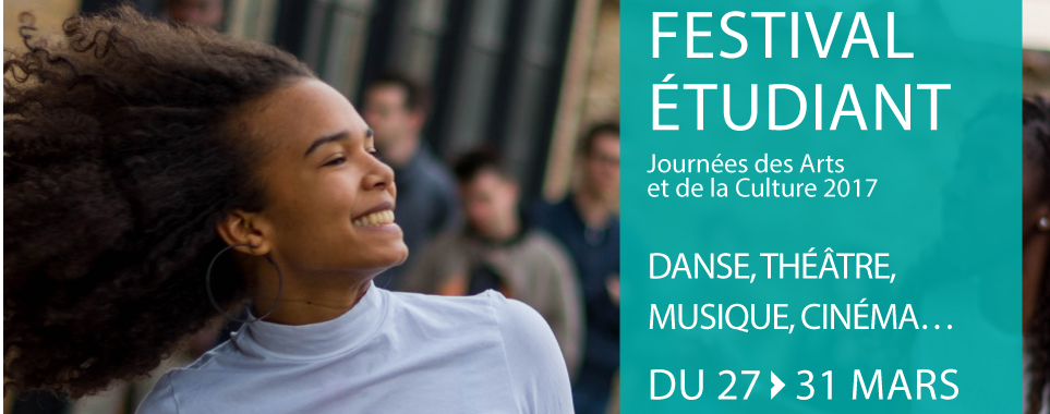Journées des Arts et de la Culture Festival étudiant, de créations et d’images 27-28-29-30-31 Mars 2017 https://youtu.be/Y3FnLwDOpIg Quatre jours d’émerveillement autour de la Création Culturelle Universitaire au sens large théâtre, danse, musique, cinéma, écriture …. dans un esprit de partage, d’échange, de découvertes, de curiosités et de rencontres privilégiées. La démonstration de l’implication motivée des étudiants dans la construction de projets participatifs innovants et l’émergence de dynamiques fédératives. Un moment pour se saisir de la culture dans toutes ses dimensions pour que les campus deviennent des lieux de transmission, de diffusion et de productions culturelles. Le Festival étudiant est la vitrine des actions culturelles menées sur les campus émanant entre autre des associations étudiantes, et de projets participatifs étendus à un public élargi universitaire ou faisant appel à la population de la ville. Un festival ouvert sur le handicap, sur l’international avec les valeurs interculturelles des étudiants et un festival écologiquement responsable respectant tous les piliers du développement durable. Une occasion de dynamiser les actions de partenariats culturels avec l’Opéra, le Théâtre de la passerelle et les Musées de proximité. Flyer Programmation-5