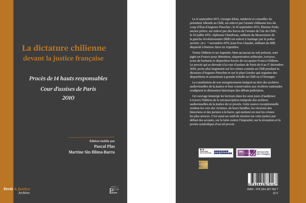Pascal Plas vient de faire paraître La dictature chilienne devant la justice française. Procès de 14 hauts responsables – Cour d’assises de Paris 2010 (dir. Pascal Plas et Martine Sin Blima-Barru), Collection Droit & Justice, Limoges, PULIM.