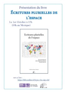 Les équipes d’EHIC (Université de Limoges) et du SAL (Sorbonne Université) organisent le 1 octobre 2021, à 17h, la présentation du volume Écritures Plurielles de l’Espace, disponible aux PULIM, et fruit collectif de leur collaboration à l’occasion des journées d’étude du même nom, qui se sont tenues à Limoges les 8 et 9 novembre 2018.