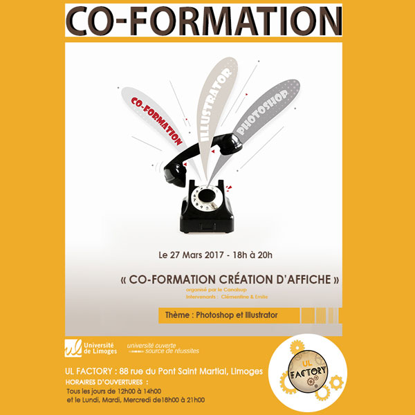 Dans cette co-formation dédiée aux étudiants de l’Université de Limoges, Clémentine et Emilie vont vous apprendre à créer une affiche en utilisant Photoshop et Illustrator. En 2 heures, vous appréhenderez le monde du print et de l’affiche en explorant les bases du graphisme et des logiciels associés.