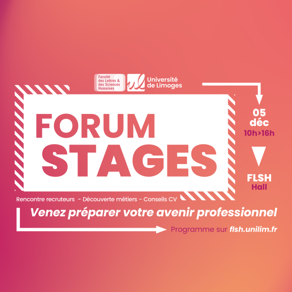 Le Forum Stages & Emplois aura lieu mardi 5 décembre 2023 de 10h à 16h en continu dans le Hall de la Faculté des Lettres et des Sciences Humaines. Il est ouvert aux étudiants de licence, licence professionnelle, et master.