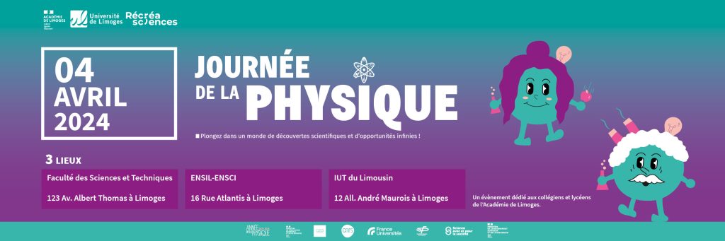 L’Université de Limoges, le Rectorat et Récréasciences organisent dans ce cadre une Journée de la Physique destinée aux collégiens et lycéens de 2nde et de 1ère de l’Académie. Cette opération aura lieu le jeudi 4 avril 2024 de 9h à 17h sur 3 sites universitaires limougeauds : la Faculté des Sciences et Techniques, l’IUT du Limousin et l’ENSIL-ENSCI.