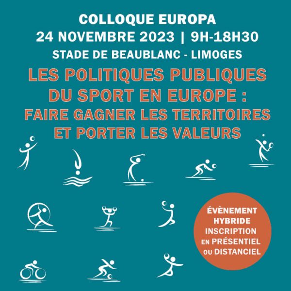Le vendredi 24 novembre 2023, aura lieu le colloque que l’association EUROPA organise, en collaboration avec le Centre de Droit et d’Economie du Sport (CDES-OMIJ), dans la salle panoramique du Stade de Beaublanc, à Limoges, sur le thème « Les politiques publiques du sport en Europe : faire gagner les territoires et porter les valeurs ? ».