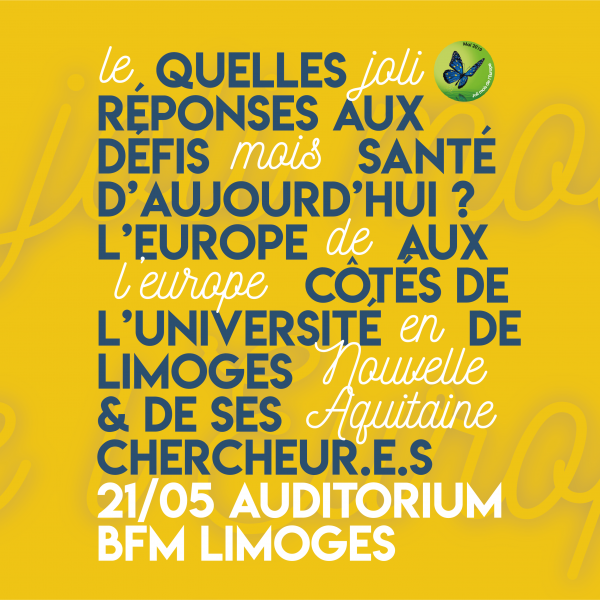 Les territoires fêtent l’Europe à l’occasion du Joli mois de l’Europe.  Si loin et en même temps si proche, l’Europe soutient les initiatives collectives et individuelles. En matière de santé, l’Europe contribue à améliorer la santé publique et à lutter contre les grands fléaux (cancers). Venez découvrir les dernières recherches et les avancées prometteuses que réalisent nos chercheurs, ici et maintenant, à l’Université de Limoges. Au service de votre santé demain, avec l’aide de l’Union européenne.