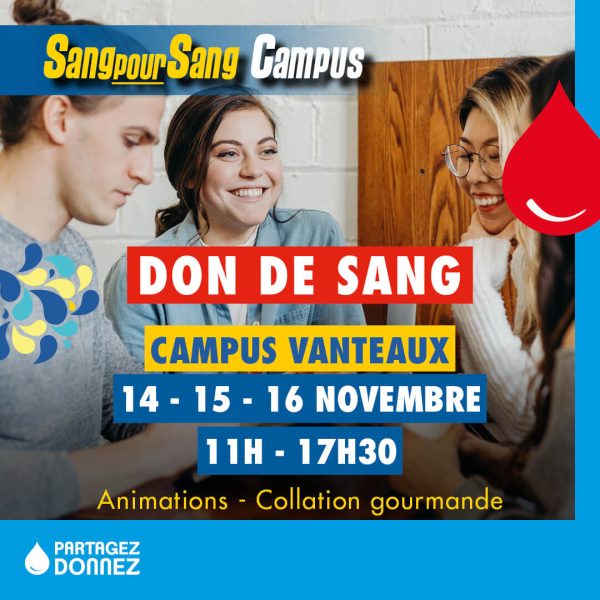 L’Établissement Français du Sang organise, en partenariat avec l’Université de Limoges, une grande collecte événementielle « Sang pour Sang Campus »  sur le site de Vanteaux les les mardi 14, mercredi 15 et jeudi 16 novembre prochains de 11h à 17h30.