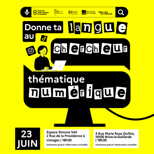 Dans le cadre du troisième appel à participation citoyenne du projet LIRES2, l’Université de Limoges et Récréasciences proposent un événement grand public qui permettra au monde de la recherche de répondre aux questions posées par la société en lien avec la thématique « Numérique ». Venez tirer au sort une question et les chercheurs et partenaires du projet vous y répondront en 2 minutes maximum !