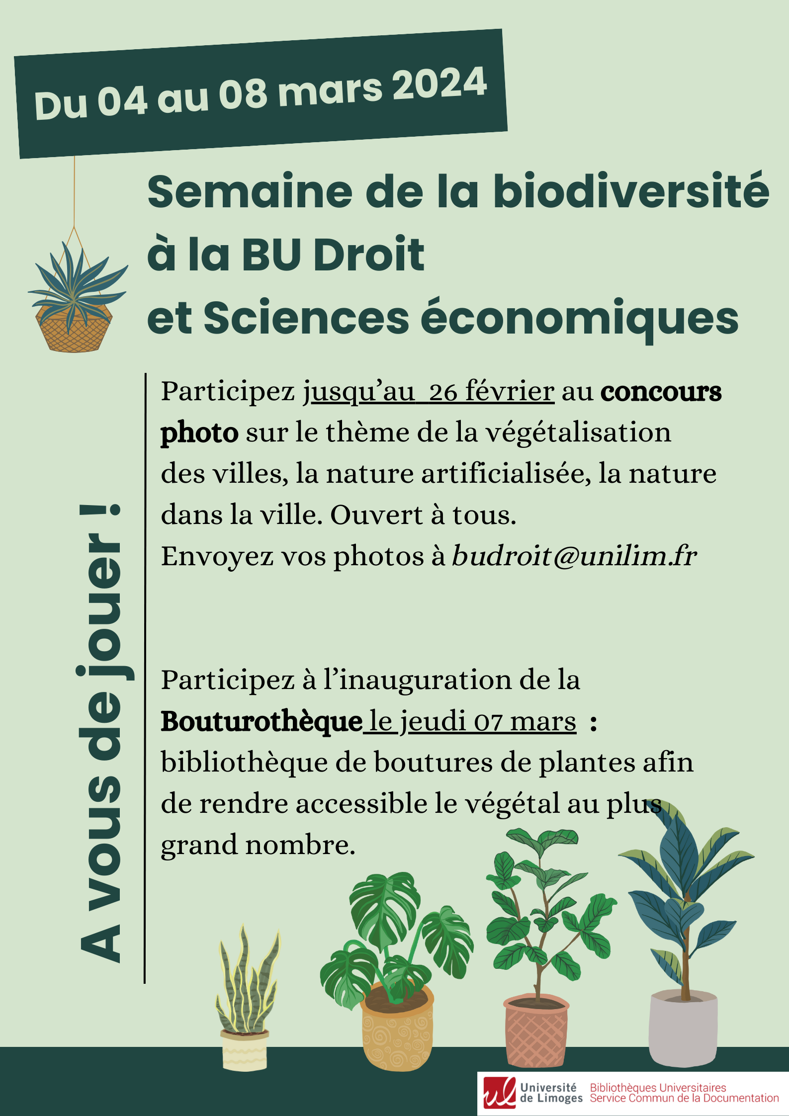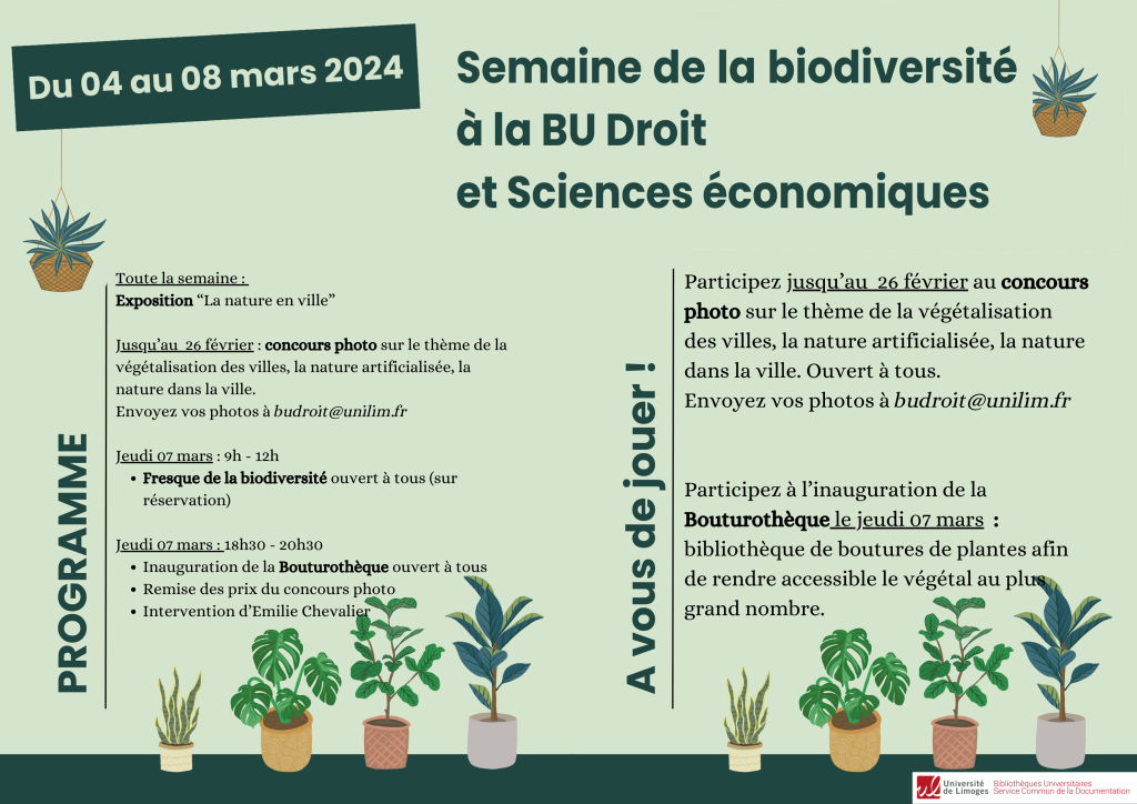 Catégories : Actualités / Développement durable / Evénements Semaine de la biodiversité Détails Start: 4 March 2024 End: 8 March 2024 Venue: Faculté de Droit et des Sciences Economiques Categories: Actualités, Développement durable, Evénements Présentation Du 4 au 8 mars 2024, la Bibliothèque Université de la Faculté de Droit et des Sciences Économiques célèbre la biodiversité ! Découvrez le programme : Plan
