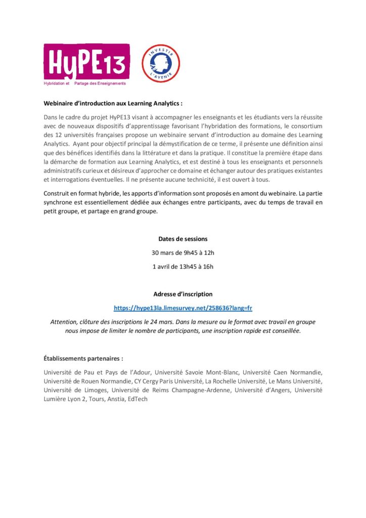 Sur une durée de 18 mois (du 1er novembre 2020 au 30 avril 2022) le projet HyPE-13 vise à accompagner les enseignants et les étudiants vers la réussite avec de nouveaux dispositifs d’apprentissage favorisant l’hybridation des formations. Face à la situation sanitaire inédite que nous traversons, ce projet offre l’opportunité de construire un collectif qui s’inscrit dans la durée dans une démarche collaborative de construction et de partage au bénéfice des acteurs de la relation pédagogique.