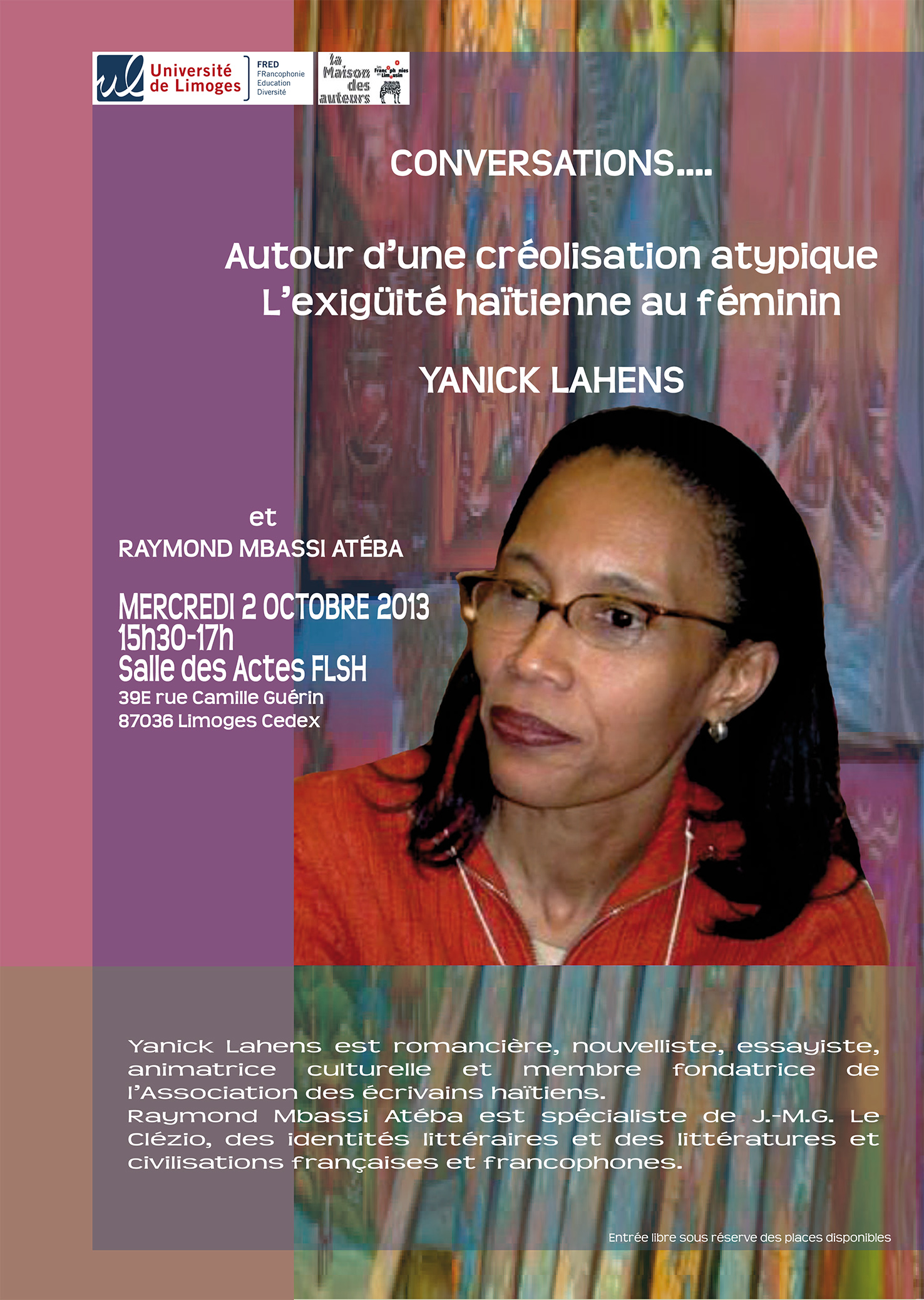 Yanick Lahens est romancière, nouvelliste, essayiste, animatrice culturelle et membre fondatrice de l’Association des écrivains haïtiens. Raymond Mbassi Atéba est spécialiste de J.-M.G. Le Clézio, des identités littéraires et des littératures et civilisations françaises et francophones.