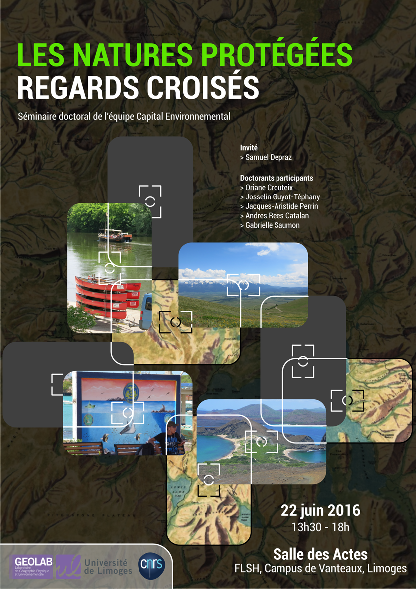13h30 – Présentation des thèses en cours par les 5 doctorants participants, en montrant des exemples de visuels (photos, cartes, petits films…) des « natures protégées » de leurs terrains (Orianne Crouteix, Josselin Guyot-Téphany, Jacques Aristide Perrin, Andres Rees Catalan, Gabrielle Saumon)