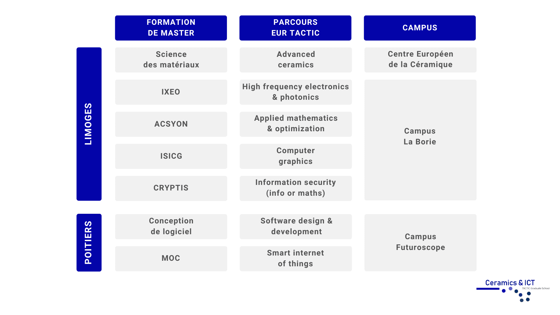 Cinq formations de master de l’EUR TACTIC relèvent de l’Université de Limoges et deux formations de l’Université de Poitiers. Votre campus dépendra donc du choix de votre formation. Pour ces formations