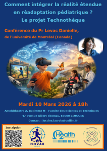 Dans le cadre de sa venue à l’Unité de Recherche HAVAE (UR20217), le Pr. Danielle LEVAC donnera une conférence sur la thématique de l’intégration de la réalité étendue en réadaptation pédiatrique, en présentant le projet « Technothèque ». Cette conférence ouverte à tous sera organisée le mardi 10 mars 2025 à 18h, dans l’amphithéâtre A du Batiment M de la Faculté des Sciences et Techniques, 45 avenue Albert Thomas à Limoges.