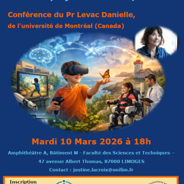 Dans le cadre de sa venue à l’Unité de Recherche HAVAE (UR20217), le Pr. Danielle LEVAC donnera une conférence sur la thématique de l’intégration de la réalité étendue en réadaptation pédiatrique, en présentant le projet « Technothèque ». Cette conférence ouverte à tous sera organisée le mardi 10 mars 2025 à 18h, dans l’amphithéâtre A du Batiment M de la Faculté des Sciences et Techniques, 45 avenue Albert Thomas à Limoges.