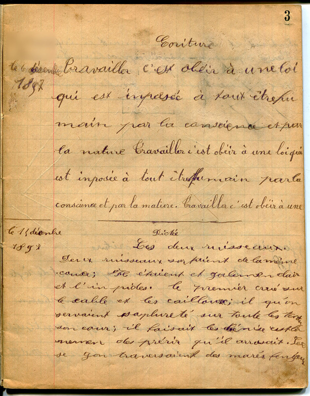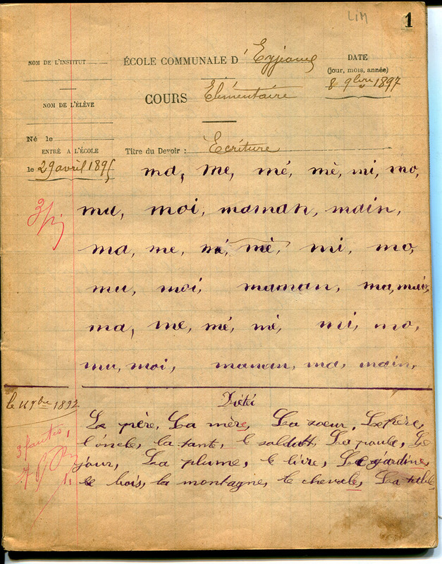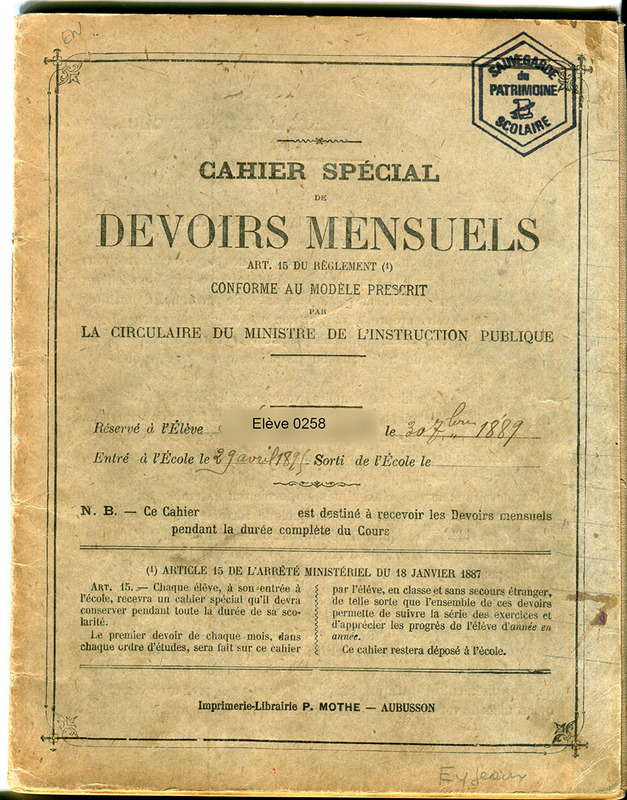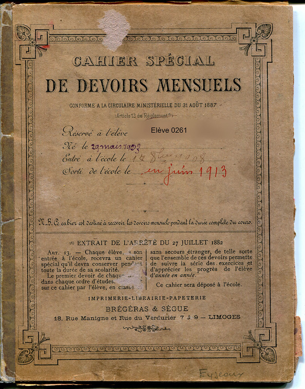 Cette collection est la plus importante quantitativement. Elle rassemble de nombreux types de cahiers comme les cahiers d’honneur, les cahiers de contrôle ou de composition, les cahiers de brouillon, les cahiers de roulement, les cahiers de devoirs mensuels, les cahiers de devoirs journaliers autrement appelés cahiers du jour, les cahiers disciplinaires (correspondant à un seul domaine d’enseignement). Ont aussi été intégrés les cahiers de travaux collectifs ou documentaires qui sont l’oeuvre, sur un thème donné, de plusieurs élèves.