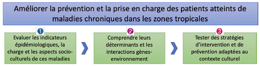 L’équipe EpiMaCT est rassemblée autour d’un objectif commun : l’épidémiologie des maladies chroniques en zone tropicale. Nos recherches visent à contribuer à l’amélioration de la santé des populations de la zone tropicale, en oeuvrant dans trois domaines : la recherche académique, la formation par la recherche et des collaborations visant le renforcement de ces capacités au sud. Notre vision à long terme est de contribuer à l’amélioration de la santé des populations par une meilleure compréhension de l’épidémiologie des maladies chroniques en zone tropicale. Quelque soit les actions conduites, nous souhaitons à terme proposer des stratégies qui amélioreront l’accès aux soins des patients. Nos objectifs stratégiques sont donc les suivants :
