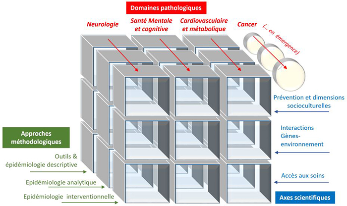 Afin de répondre aux 3 objectifs stratégiques, la structuration est la suivante : 3 domaines pathologiques privilégiés (neurologie, santé mentale et cognitive, cardiovasculaire et métabolique) et un domaine en émergence (cancer), 3 axes renouvelés, plus transversaux, et revenant aux fondamentaux épidémiologiques, 3 approches méthodologiques accompagnant ces axes, et des compétences transversales autour de l’épidémiologie, de la nutrition, des sciences humaines et sociales et de la génétique médicale.