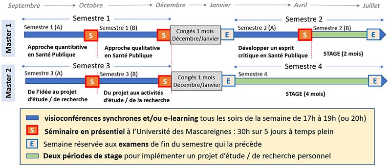 La maquette est structurĂ©e autour de 7 unitĂ©s d’enseignements : UE1 : MĂ©thodologie de la recherche en SantĂ© Publique (104 heures, 17 ECTs) UE2 : EpidĂ©miologie et processus pathogènes (100 heures, 14 ECTs) UE3 : Education et promotion de la SantĂ© (100 heures, 15 ECTs) UE4 : Contextes sanitaires et sociĂ©taux (60 heures, 10 ECTs) UE5 : SantĂ© du futur – Intelligence Artificielle (115 heures, 20 ECTs) UE6 : Gestion/Management de structures de soins et Systèmes de SantĂ© (40 heures, 4 ECTs) UE7 : Projet de recherche/d’étude personnel : Deux stages (2 et 4 mois) – (738 heures, 40 ECTs)