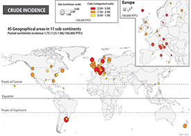 La variabilité de l’expression de la SLA entre les populations humaines retient actuellement l’attention de la communauté scientifique. Notre équipe a réalisé récemment un travail important de revue de littérature concernant les études de la SLA en population générale, à l’échelle mondiale. Nous avons abouti à l’identification de 44 travaux (correspondant à 45 zones géographiques) relatifs à l’incidence de la SLA et du phénotype des patients.