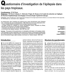 Dès 1998, l’IENT (UMR1094 Inserm) a proposé un questionnaire pour servir d’outil standardisé de recueil des données sur l’épilepsie dans ces régions spécifiques. Ce questionnaire était soutenu par la Ligue internationale Contre l’Epilepsie (LICE) car il visait une utilisation très large, permettant de confronter les résultats de différentes enquêtes, et de construire des hypothèses nouvelles qui seraient ensuite testées par des enquêtes spécifiques. Initialement élaboré par les membres d’un Comité de recherche multidisciplinaire, ce questionnaire a été discuté avec des experts internationaux et utilisé lors de recherches épidémiologiques et lors d’enquêtes hospitalières réalisées dans de nombreux pays africains . Il a ainsi montré son applicabilité et sa faisabilité. La version finale s’est construite autour de 4 grands objectifs : dépister les patients atteints, décrire les formes cliniques, rechercher les étiologies et évaluer les traitements prescrits. Sa structure est modulaire et comprend les 9 sections suivantes : données démographiques, dépistage, confirmation de l’épilepsie, histoire naturelle de l’épilepsie, antécédents, examen clinique, examens complémentaires, étiologies et traitements antiépileptiques.