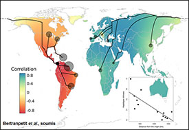 Toxoplasma gondii, protozoaire ubiquitaire chez les mammifères et les oiseaux, est l’agent Ă©tiologique de la toxoplasmose, une maladie posant un rĂ©el problème de santĂ© publique dans le monde avec environ 200 000 nouveaux cas de toxoplasmose congĂ©nitale chaque annĂ©e. Il a Ă©tĂ© montrĂ© que la sĂ©vĂ©ritĂ© clinique de la toxoplasmose variait en fonction des rĂ©gions gĂ©ographiques, avec en particulier l’AmĂ©rique du Sud qui paie le plus lourd tribu de cette maladie. Malheureusement, les mĂ©canismes de ces disparitĂ©s gĂ©ographiques sont encore peu compris et l’origine gĂ©ographique ainsi que l’histoire Ă©volutive du pathogène sont encore incertaines. Une collection mondiale de 168 isolats de T. gondii recueillis dans 13 populations de 5 continents a Ă©tĂ© sĂ©quencĂ©e pour cinq fragments de gènes (140 single nucleotide polymorphisms Ă partir de 3153 bp par isolat). La phylogĂ©nie basĂ©e sur les mĂ©thodes de Maximum de vraisemblance avec une estimation de l’âge du plus rĂ©cent ancĂŞtre commun (TMRCA) et des analyses gĂ©ostatistiques ont Ă©tĂ© rĂ©alisĂ©es afin d’infĂ©rer l’origine hypothĂ©tique de T. gondii. Nous montrons que les souches actuelles de ce parasite ont vraisemblablement Ă©voluĂ© Ă partir d’un ancĂŞtre Sud-AmĂ©ricain il y a environ 1,5 million d’annĂ©es et avons reconstruit la propagation mondiale du pathogène qui a suivi. Cette Ă©mergence est beaucoup plus rĂ©cente que l’apparition de la forme ancestrale de T. gondii il y a environ 11 Ma et est postĂ©rieure Ă l’arrivĂ©e des fĂ©lidĂ©s dans cette partie du monde. Nous proposons que la lignĂ©e ancestrale de T. gondii ait Ă©tĂ© introduite en AmĂ©rique du Sud avec les fĂ©lidĂ©s et que l’évolution de l’infectivitĂ© orale des kystes tissulaires Ă travers le carnivorisme ainsi que la diversification des fĂ©lidĂ©s dans cette rĂ©gion du monde a permis l’apparition d’une nouvelle souche ayant une capacitĂ© de transmission beaucoup plus efficace que la lignĂ©e ancestrale, ce qui lui a permis de la supplanter et d’avoir une distribution pandĂ©mique.