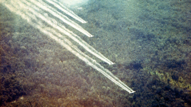Photo : Defoliant spray run, part of Operation Ranch Hand, during the Vietnam War by UC-123B Provider aircraft, U. S. Air Force.