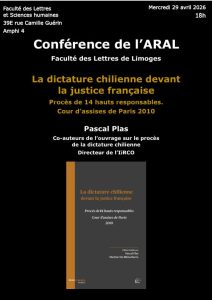 Catégories : Actualité Conférence : La dictature chilienne devant la justice française Conférence : La dictature chilienne devant la justice française 33 rue François Mitterrand BP 23204 87032 Limoges - France Tél. +33 (5) 05 55 14 91 00 université ouverte source de réussites