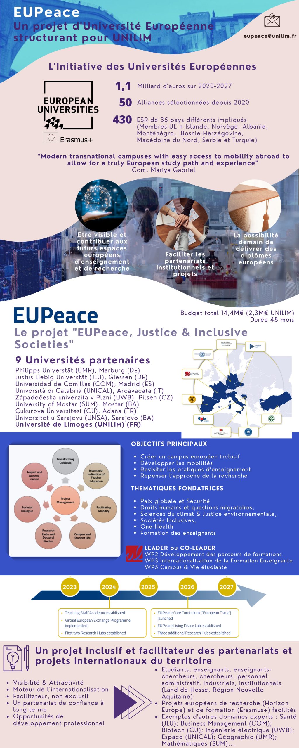 L’Université européenne pour la paix, la justice et une société inclusive, EUPeace, est le fruit du travail de neuf universités membres qui ont engagé leurs perspectives stratégiques internationales en matière d’enseignement, de recherche et d’administration de l’enseignement supérieur en faveur des idées et des valeurs fondamentales exprimées dans la déclaration de mission d’EUPeace, créée conjointement.