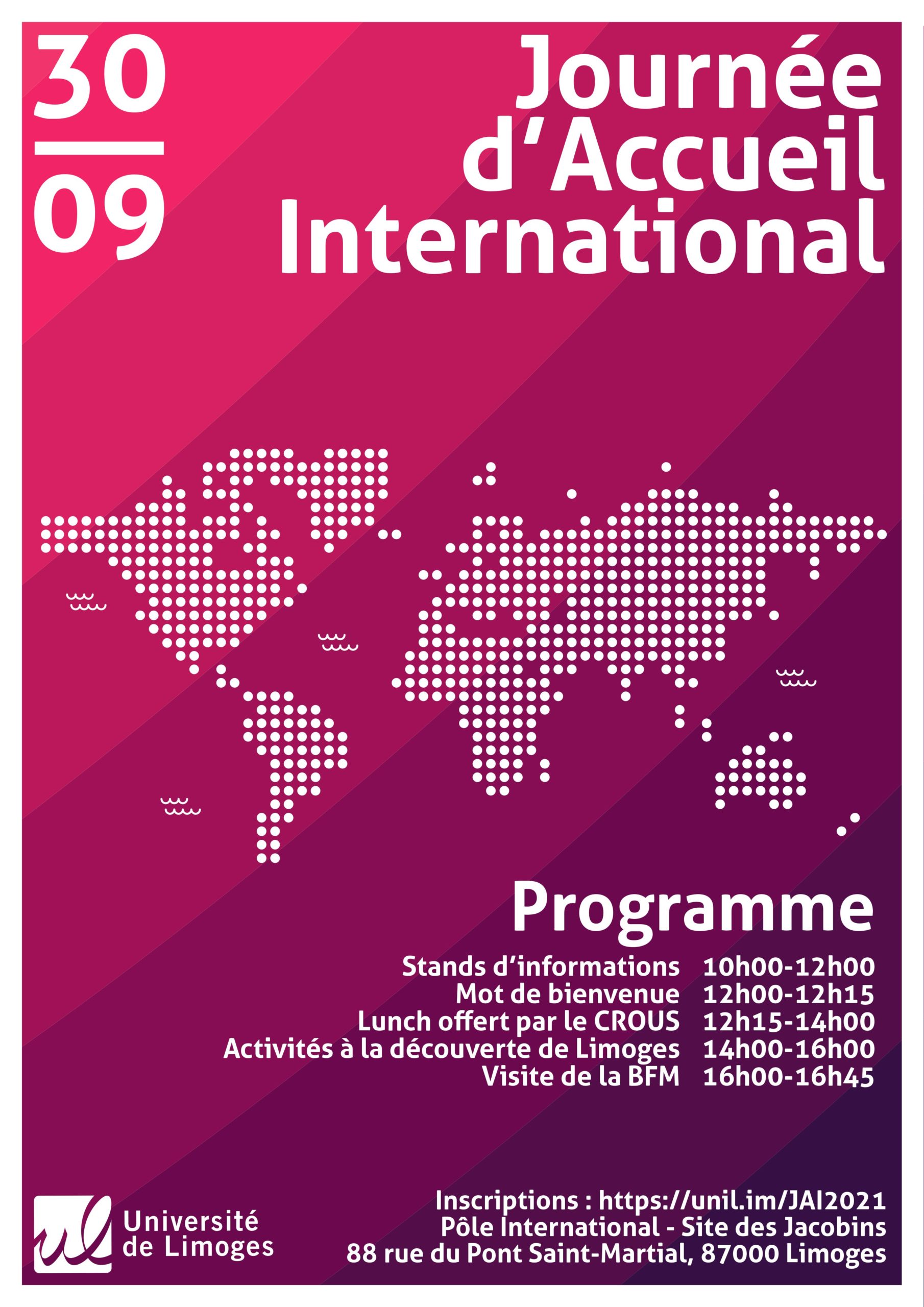 Catégories : Bienvenue à l’Université de Limoges – Journée d’Accueil International 2021 ! Détails Début: 30 septembre 2021 Lieu: Bureau d'Accueil International (BAI) Présentation Le 30 septembre 2021, venez nombreux à la Journée d’Accueil International! Une belle opportunité pour rencontrer de nouveaux étudiants et d’obtenir les informations utiles à votre séjour à Limoges! Plan