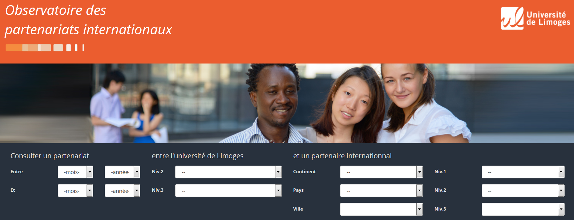 L’Observatoire des partenariats est un outil qui permet d’assurer un suivi des partenariats internationaux de l’Université de Limoges, et d’en mesurer l’activité en temps réel. Il s’agit d’un outil d’aide à la décision parfaitement intégré au Système d’Information de l’Université. In fine, cette interface informatique a une double mission :