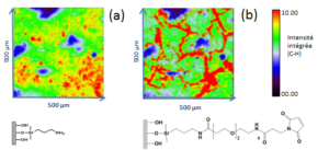 Puis nous illustrerons par des exemples, notamment concernant l’apport de l’imagerie 2D et 3D. Nous mettrons ainsi en évidence comment il est possible d’obtenir une information chimique sur la répartition spatiale des fonctions recherchées à l’échelle micronique.