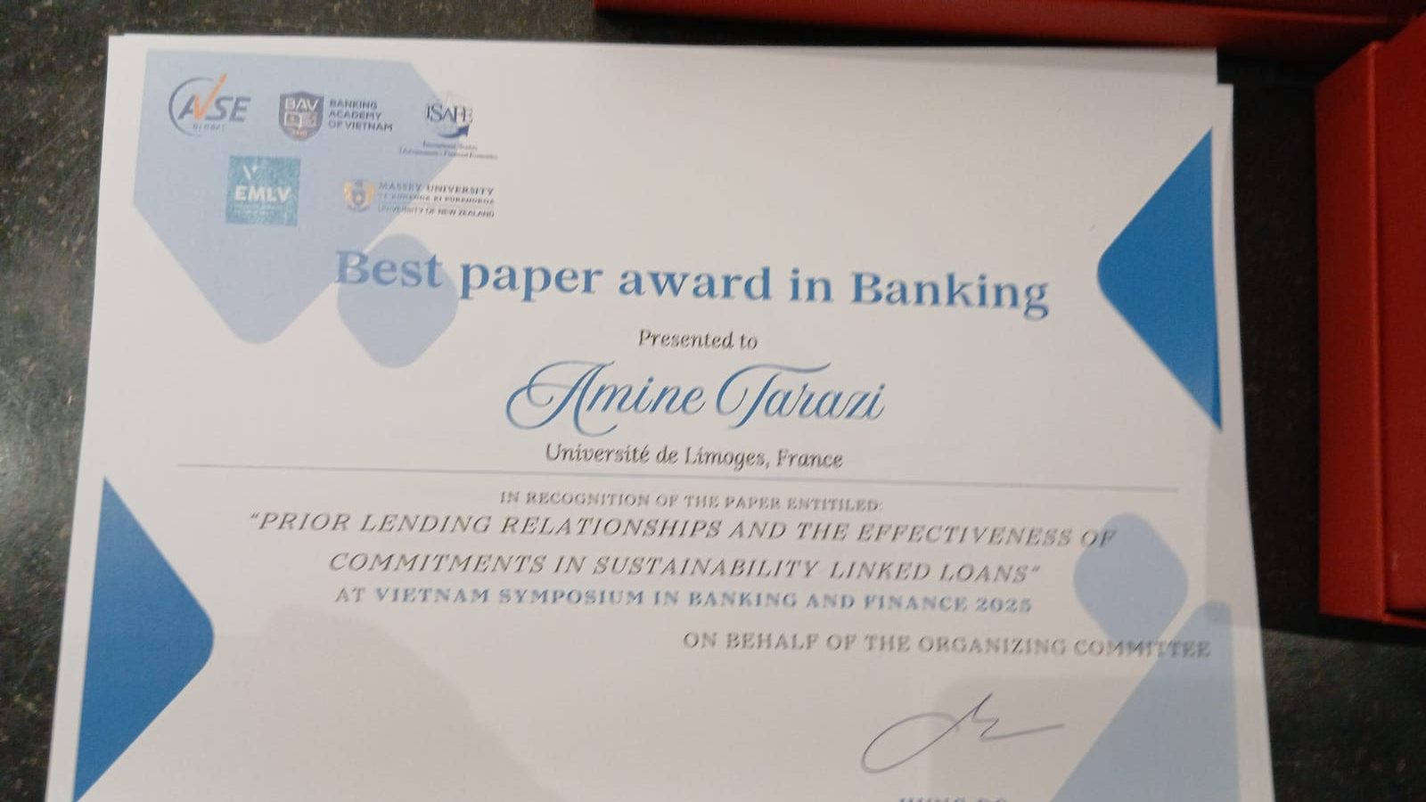 Amine Tarazi and his co-authors received the Best Paper Award in Banking for their paper, ‘Prior Lending Relationship and the Effectiveness of Commitments in Sustainability-Linked Loans’ at the 2025 Vietnam Symposium on Banking and Finance.