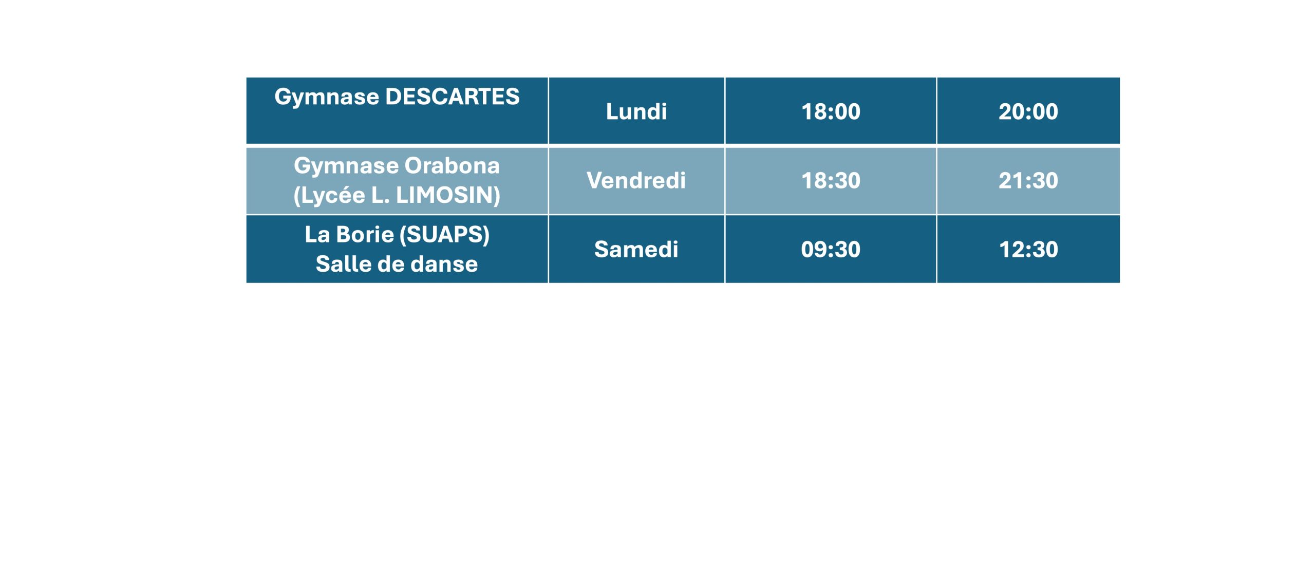 Les horaires Les entraînements ont lieu au Gymnase DESCARTES, au Gymnase ORABONA (Lycée LIMOSIN) ou au SUAPS (Campus La Borie) à Limoges SAISON 2025/2026 REPRISE LE mercredi 23 juillet 2025