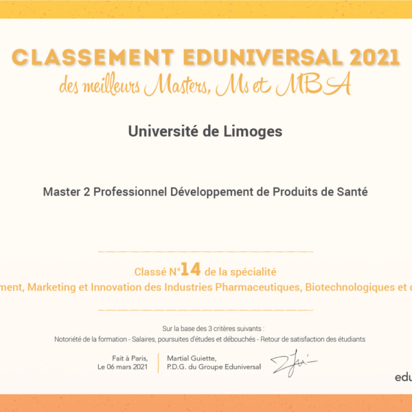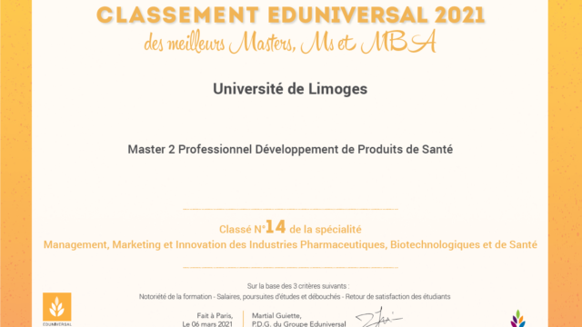 Le Master 2 Professionnel Développement de Produits de Santé proposé par la Faculté de Pharmacie de l’Université de Limoges se classe 14ème du classement SMBG* 2021 des meilleurs Masters, MS et MBA de la spécialité au niveau national. Il est à noter que seuls 2 Masters portés par des Universités apparaissent dans ce classement (Université Paris-Saclay / Université Paris-Sud et Université de Limoges). Les critères retenus sont : Notoriété de la formation – Salaires, poursuites d’études et débouchés – Retour de satisfaction des étudiants.