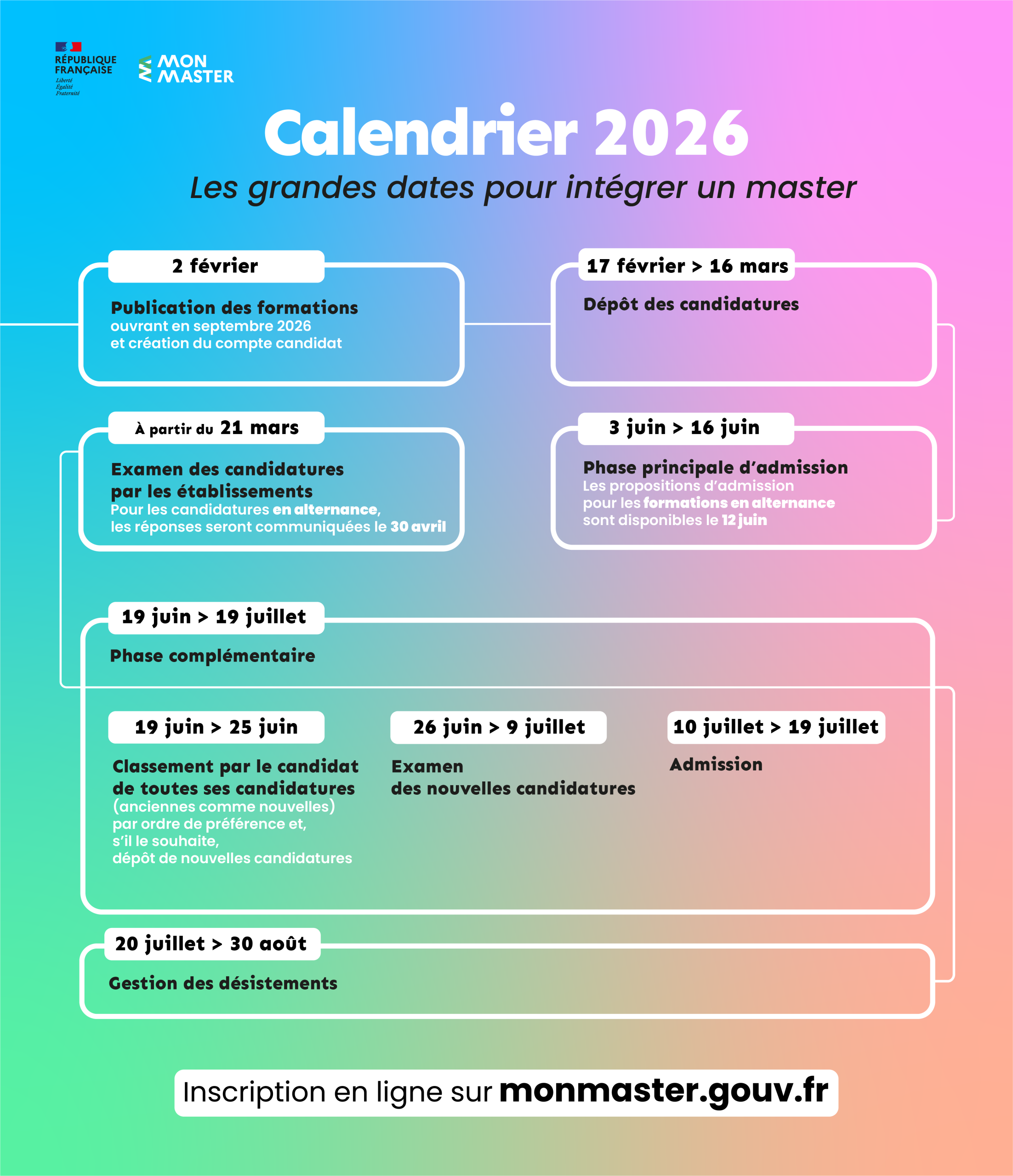 La plateforme Mon Master vous permet de candidater sur l’ensemble des masters en France. Vous pouvez formuler vos voeux du 17 février au 16 mars 2026. Une procédure simplifiée : un seul dossier pour toutes vos candidatures ! La phase d’admission se déroulera du 3 au 16 juin 2026. Vous recevrez, à ce moment-là, les réponses d’admissions des établissements auxquels vous aurez postulé. Lancez-vous !