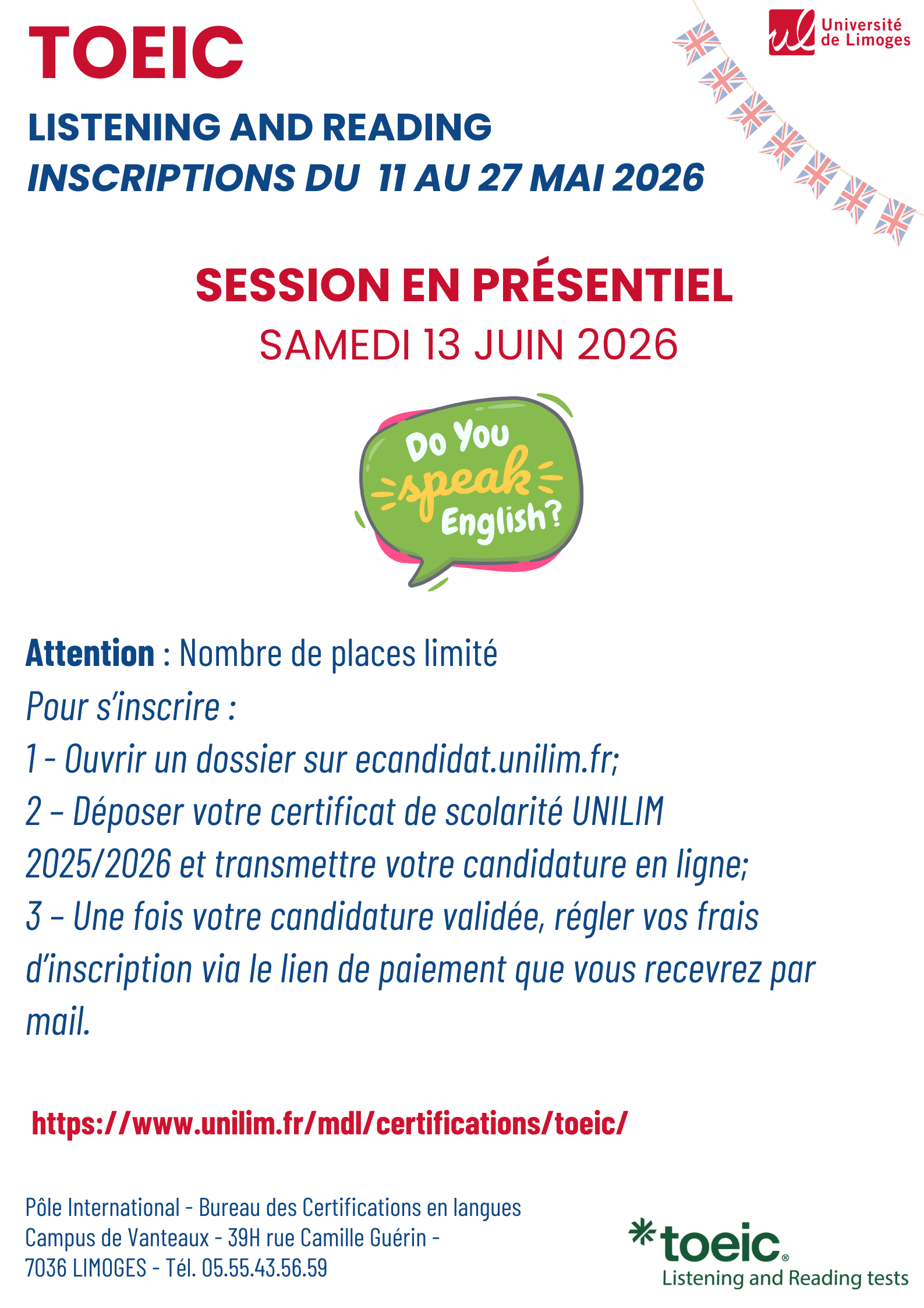 Merci de bien vouloir vous inscrire tout d’abord auprès de la Maison des langues de l’Université de Limoges à la session TOIEC Listening and Reading en présentiel via ecandidat, grâce aux informations ci-après :