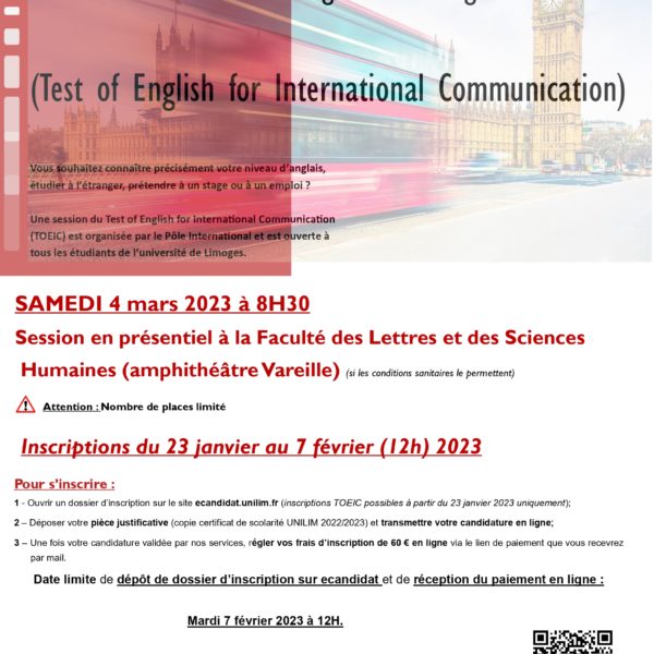La session TOEIC Listening and Reading du samedi 4 mars 2023 (matin) sera une session en présentiel, qui se tiendra à la Faculté des Lettres et des Sciences Humaines (uniquement si les conditions sanitaires le permettent).