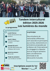 Sur la base du volontariat, deux ou trois étudiants de langue maternelle différente s’engagent à se rencontrer régulièrement pour échanger dans leurs langues et échanger sur leurs cultures respectives. Véritable levier d’intégration, d’ouverture culturelle et d’enrichissement personnel, le dispositif repose sur le volontariat et favorise l’engagement actif des participants. L’année 2025–2026 aura pour fil rouge la thématique « Les Lumières du monde », un thème universel, porteur de symboliques fortes : mémoire, fête, spiritualité, savoir, résistance… Les tandems seront invités à explorer ce thème dans leur culture d’origine et à le faire dialoguer avec celle de leur binôme. Des temps forts ponctueront l’année : soirées festives, escape game interculturel, création d’objets et de messages lumineux symboliques, sorties culturelles.