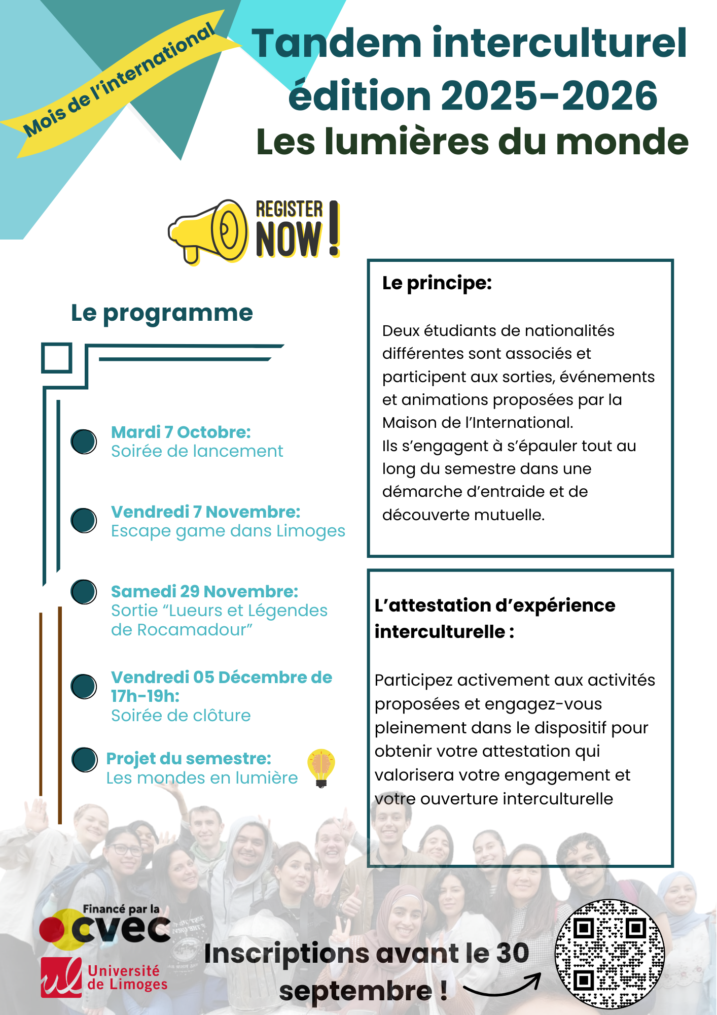 Sur la base du volontariat, deux ou trois étudiants de langue maternelle différente s’engagent à se rencontrer régulièrement pour échanger dans leurs langues et échanger sur leurs cultures respectives. Véritable levier d’intégration, d’ouverture culturelle et d’enrichissement personnel, le dispositif repose sur le volontariat et favorise l’engagement actif des participants. L’année 2025–2026 aura pour fil rouge la thématique « Les Lumières du monde », un thème universel, porteur de symboliques fortes : mémoire, fête, spiritualité, savoir, résistance… Les tandems seront invités à explorer ce thème dans leur culture d’origine et à le faire dialoguer avec celle de leur binôme. Des temps forts ponctueront l’année : soirées festives, escape game interculturel, création d’objets et de messages lumineux symboliques, sorties culturelles.