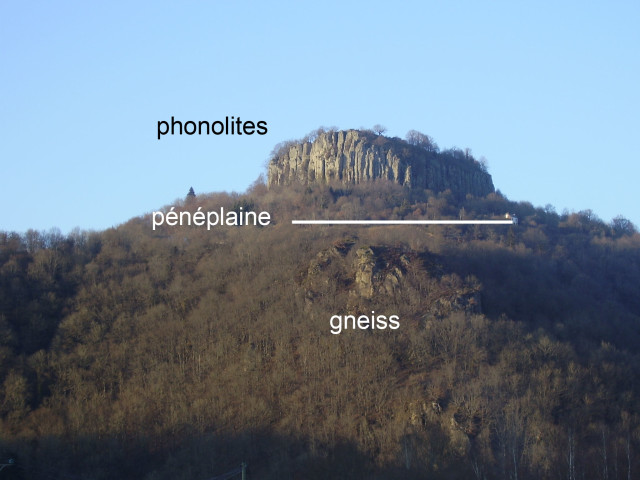 La coulée phonolitique tertiaire (5Ma) de Bort-Les-Orgues repose directement sur des gneiss qui se sont formés à l’ère primaire (400 Ma). La vallée depuis laquelle est prise la photographie est plus récente que les phonolites puisqu’elle les entaille ; son âge est donc inférieur à 5 Ma. cl. HB.