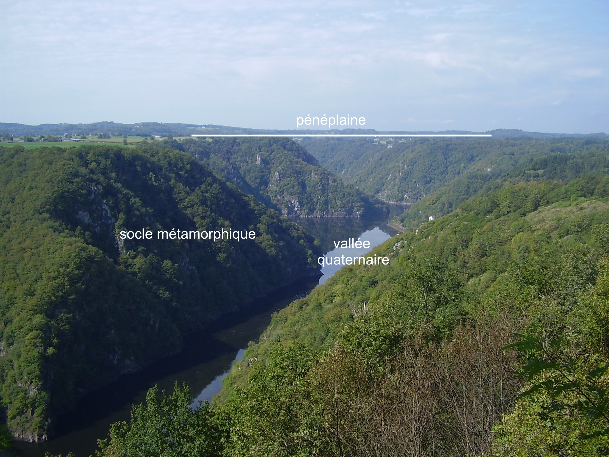 A la fin de l’ère primaire, la région était entièrement aplanie et au niveau de la mer (voire en dessous!) ; c’est la pénéplaine. A la fin de l’ère tertiaire, cette pénéplaine (le Massif central moins les volcans) se soulève et les rivières qui y coulent s’enfoncent profondément dans le socle métamorphique et granitique.