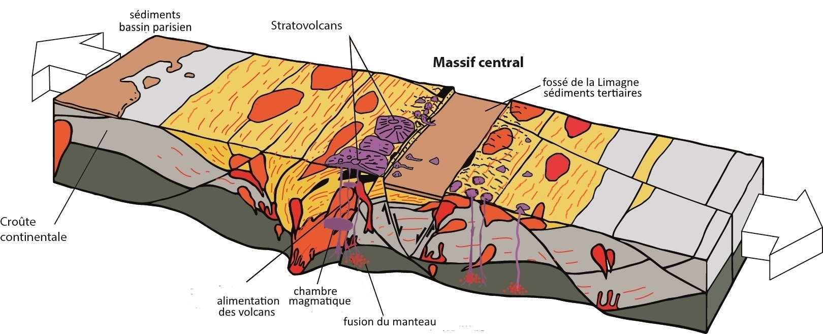 Ce soulèvement est général mais plus marqué à l’est et au sud qu’à l’ouest et au nord. Il est la conséquence de la formation des Pyrénées d’abord puis des Alpes (on dit l’orogenèse alpine). Comme ce soulèvement a été important et rapide, il a provoqué de nombreuses cassures dans le socle métamorphique et granitique qui furent autant de conduits pour un volcanisme abondant qui depuis dix millions d’années, s’est largement développé en Auvergne, en Ardèche ou en Aubrac (…) même s’il ne fait qu’effleurer le Limousin sur son flanc est.