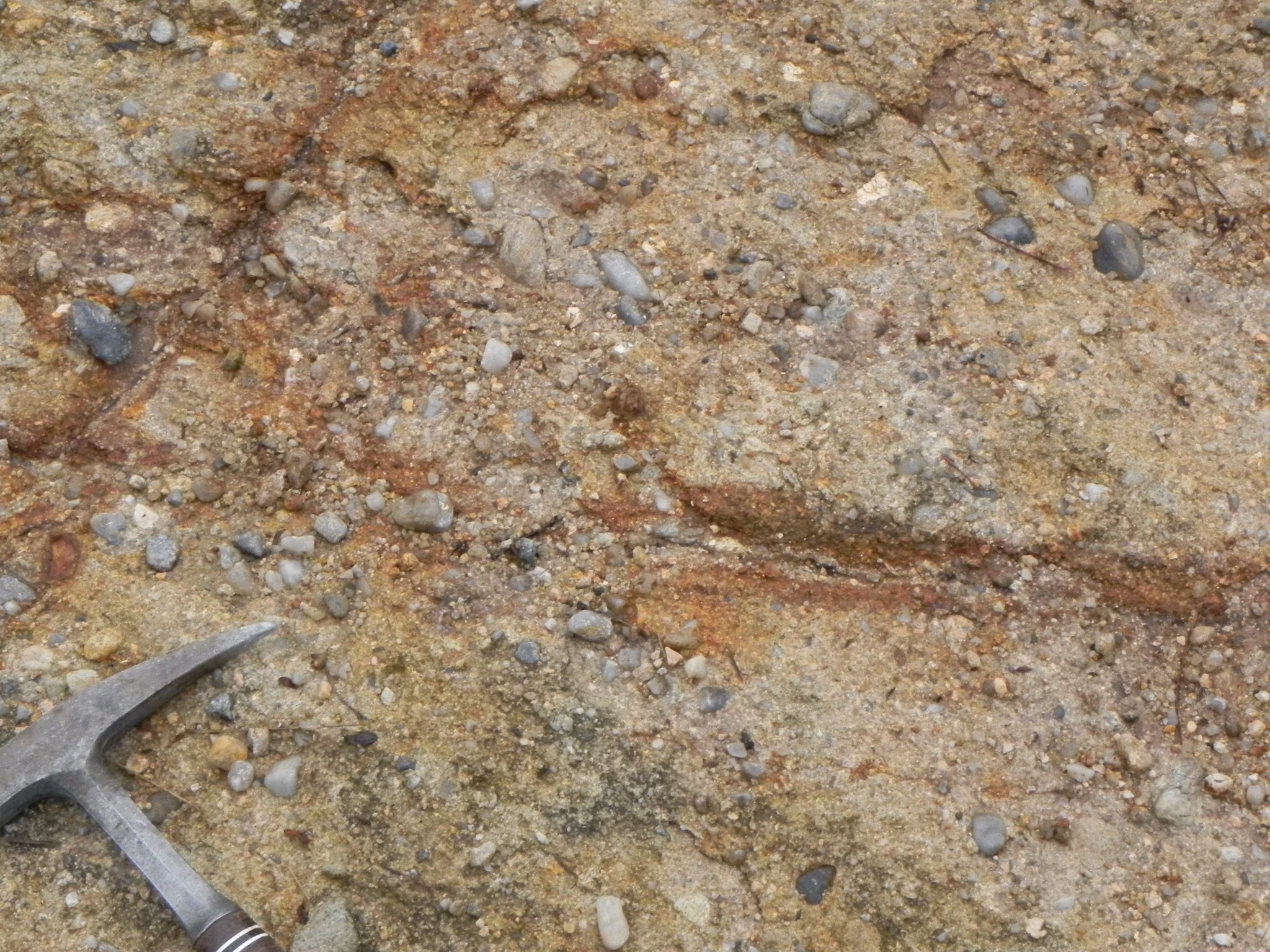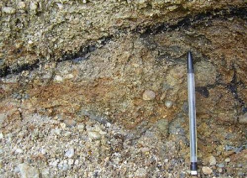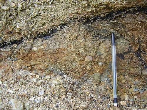 A droite, une mince couche de charbon est visible au milieu de sédiments plus grossiers. Cl HB.